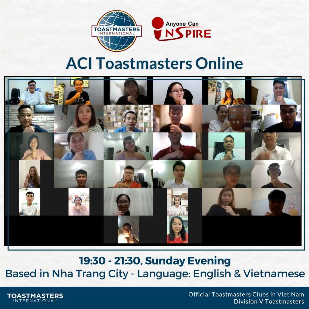 Được thành lập từ tháng 5/2021, ACI Toastmasters sinh hoạt vào 19h30 tối Chủ Nhật, 2 tuần 1 lần. Bạn có thể đăng ký và nhận Link Zoom tham gia buổi họp mặt gần nhất, hoặc liên hệ ban điều hành theo thông tin cuối trang.